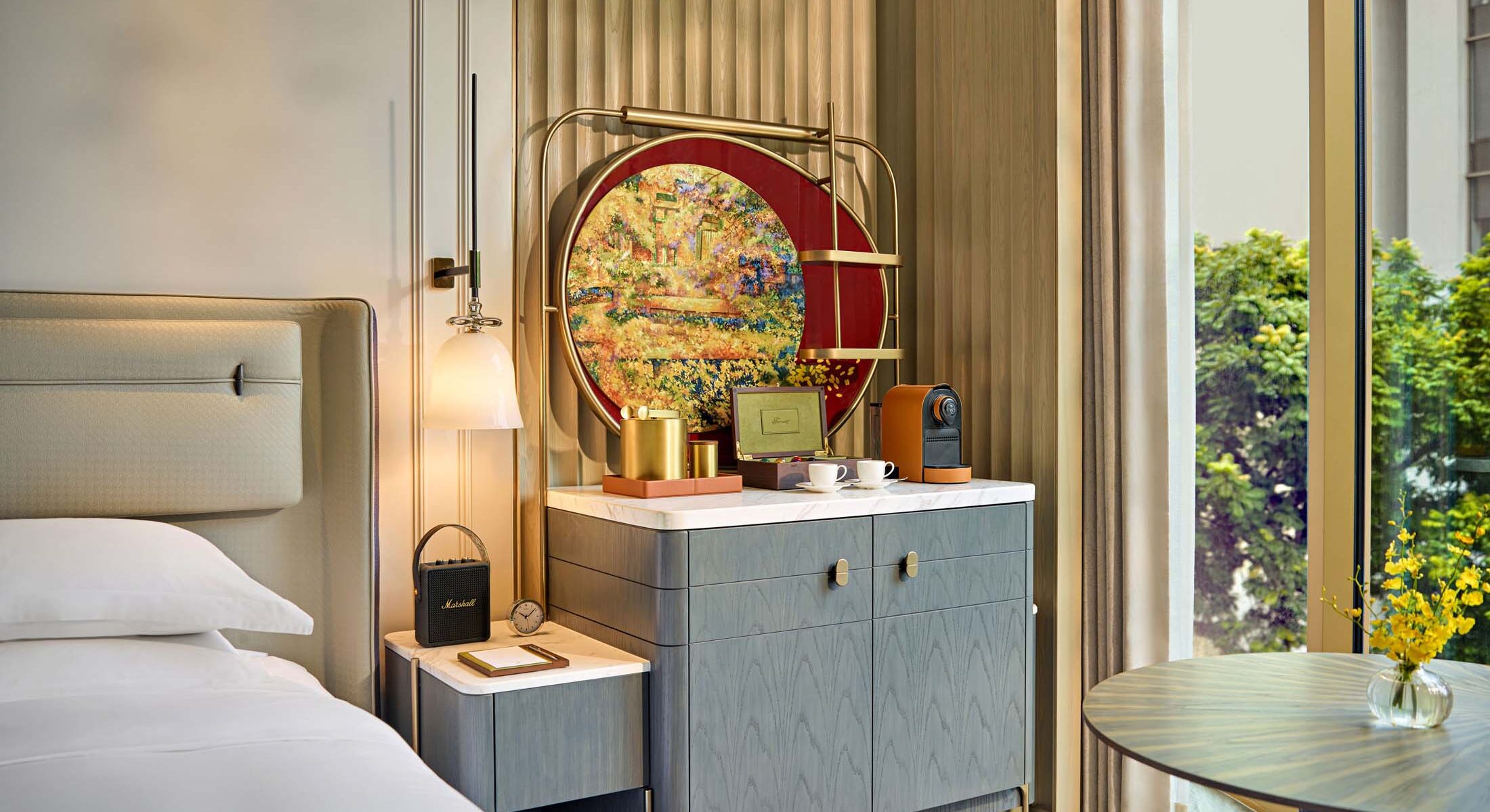 The Fairmont Twin is a quiet retreat shaped with warm wood, soft textiles, and gentle hints of Vietnamese craft blended with the city’s colonial charm. Two plush twin beds offer generous space for friends or family, while the marble bathroom with separate shower and deep soaking tub invites an unhurried pause. Natural light opens to a view of the city or the inner garden. Modern touches, including Le Labo bath products, a Marshall speaker, and Nespresso coffee, create a comfortable place to unwind after exploring Hanoi.