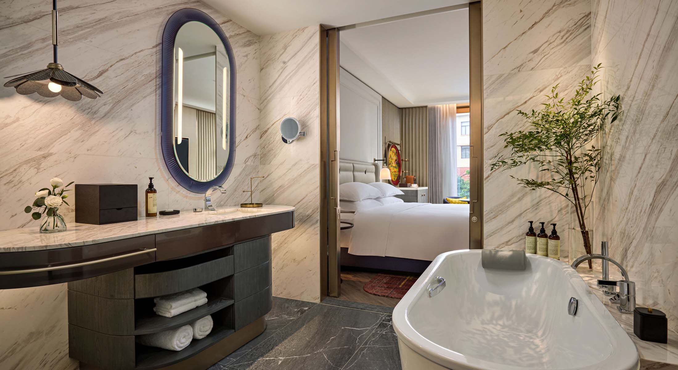 Spanning 130 m², the Signature Gold Suite offers one of Fairmont Hanoi’s most refined living experiences. A generous living room and a serene king bedroom create a quiet and inviting space shaped with warm wood accents and soft Vietnamese details. The marble bathroom features both a deep soaking tub and a separate shower for unhurried relaxation. Premium amenities include a Dyson dryer, Le Labo bath products, Nespresso coffee, an LG soundbar, IPTV, an in room mixology set, and a daily refreshed minibar. Fairmont Gold privileges elevate the stay with private lounge access, Golden Hours with cocktails and canapés, and late check out up to 15:00.